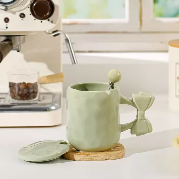 Elegant Bow Handle Mug with Lid & Spoon – 450ml Ceramic Couple Water Cup